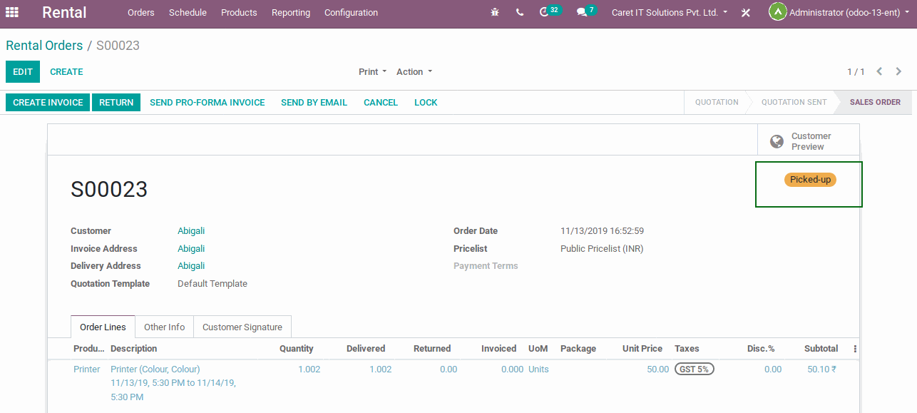 Return After the scheduled time period of rental is over and the customer has returned the product back to the vendor, a new popup validates return can be filled and we can see the Returned label on the screen.    If it is a deadly, so the delay charges are applicable which can be imposed upon the customer. We can do it on an hourly basis or a per-day basis.