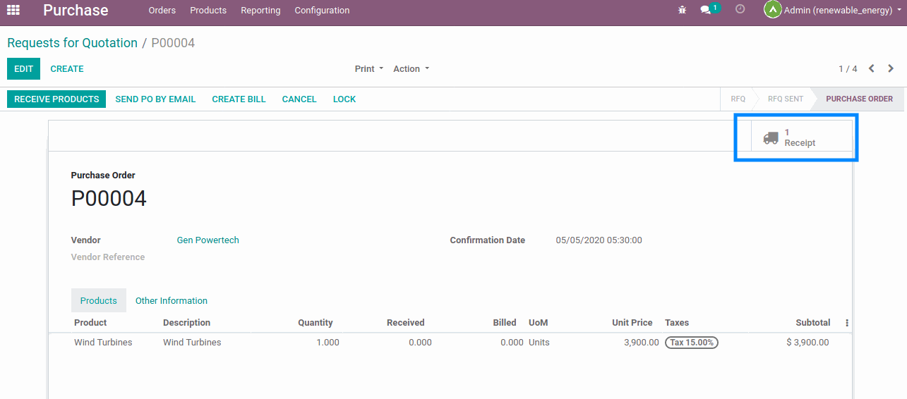 After clicking on the confirm order, the Purchase Order is created successfully. The purchase order will produce a general receipt of the finished product. Now you can view the receipt by clicking on the receipt button.