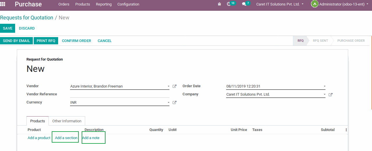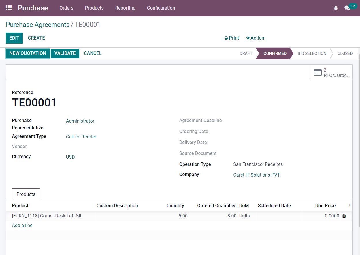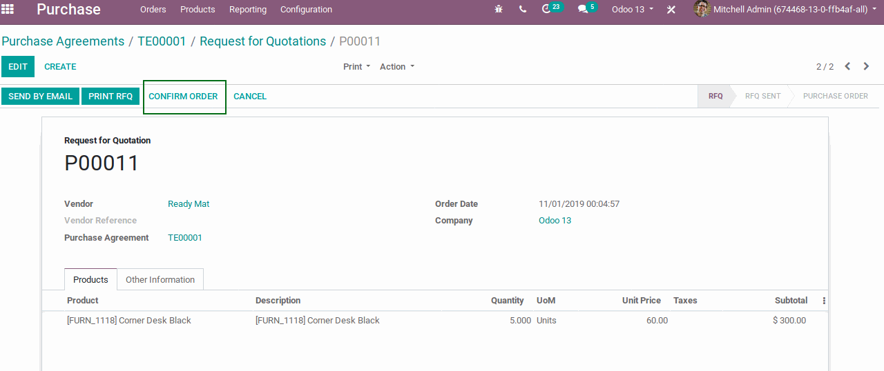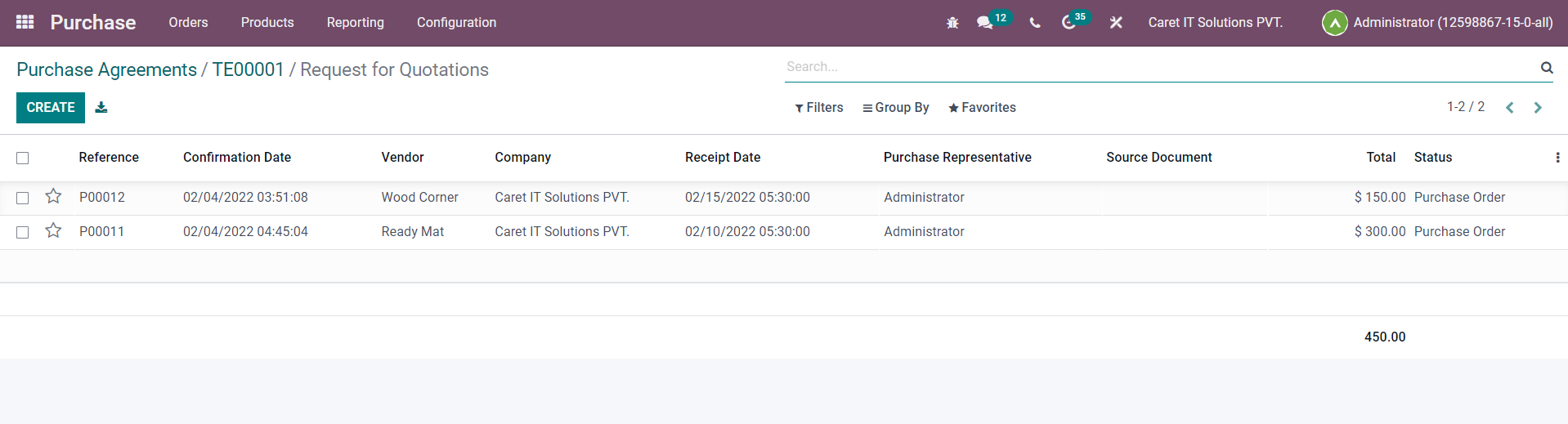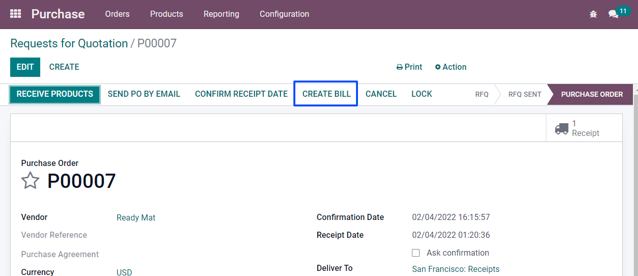 After confirming the RFQ, it will become a purchase order. We can see the purchase order from Purchase ➤ Order ➤ Purchase