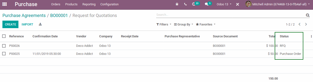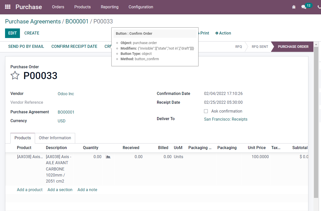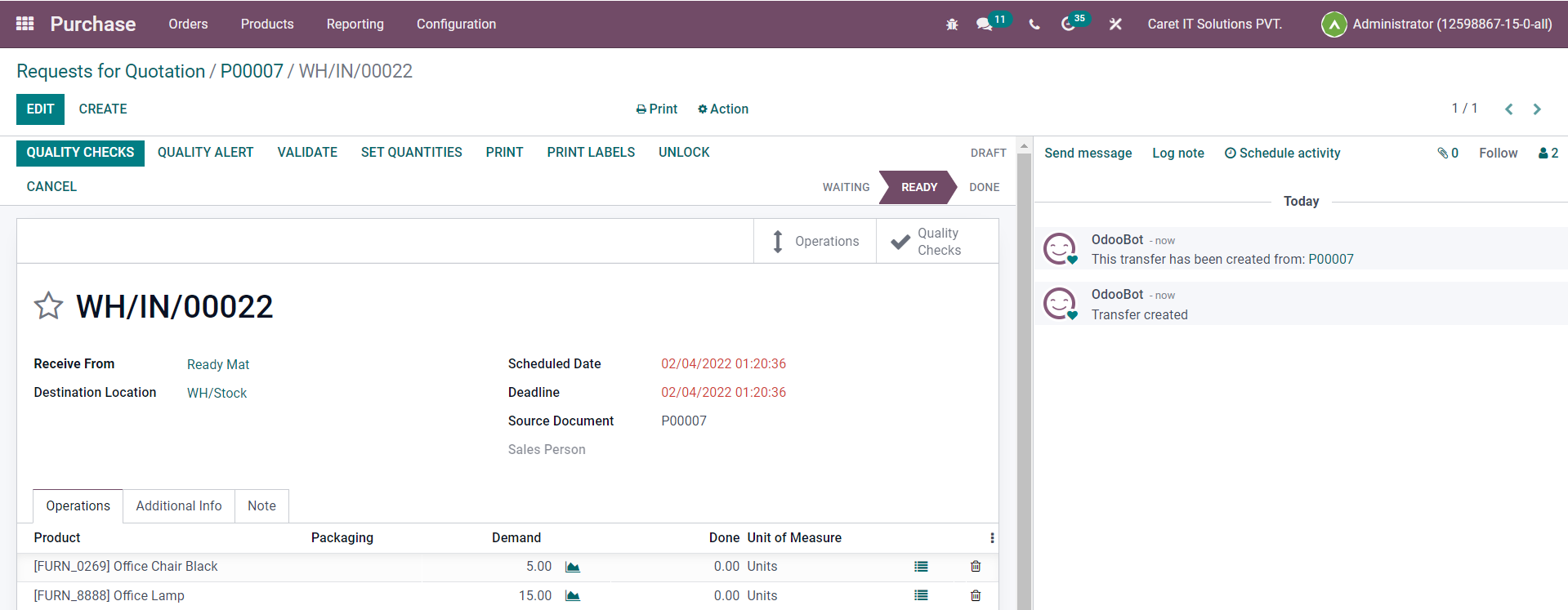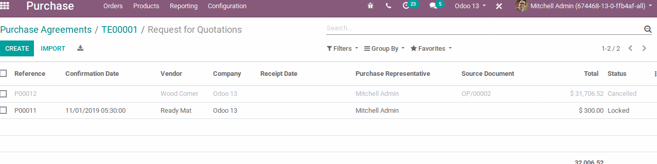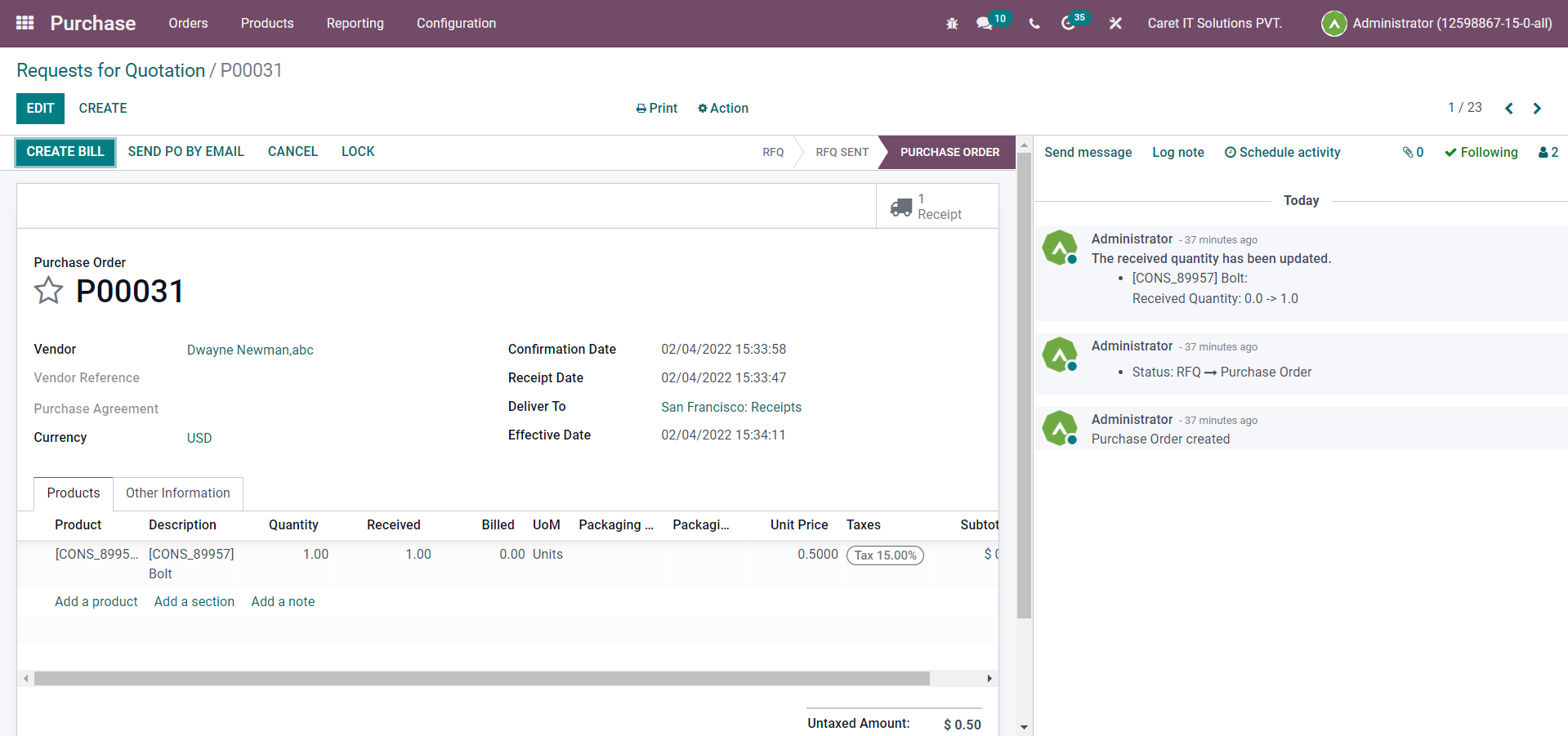 After confirming the RFQ, it will become a purchase order. We can see the purchase order from Purchase ➤ Order ➤ Purchase