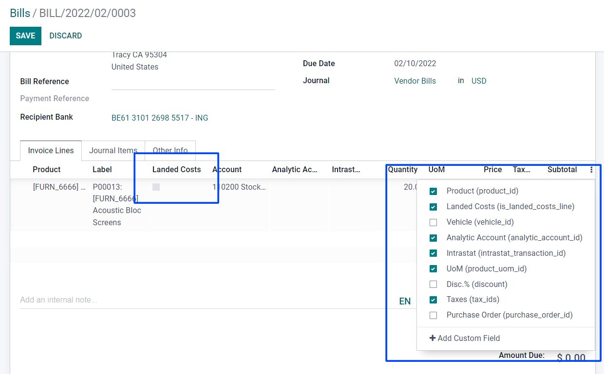 We can enable/disable fields, enable landed cost, and have journal items displayed in the vendor bill. This is a new feature added in the purchase management module.