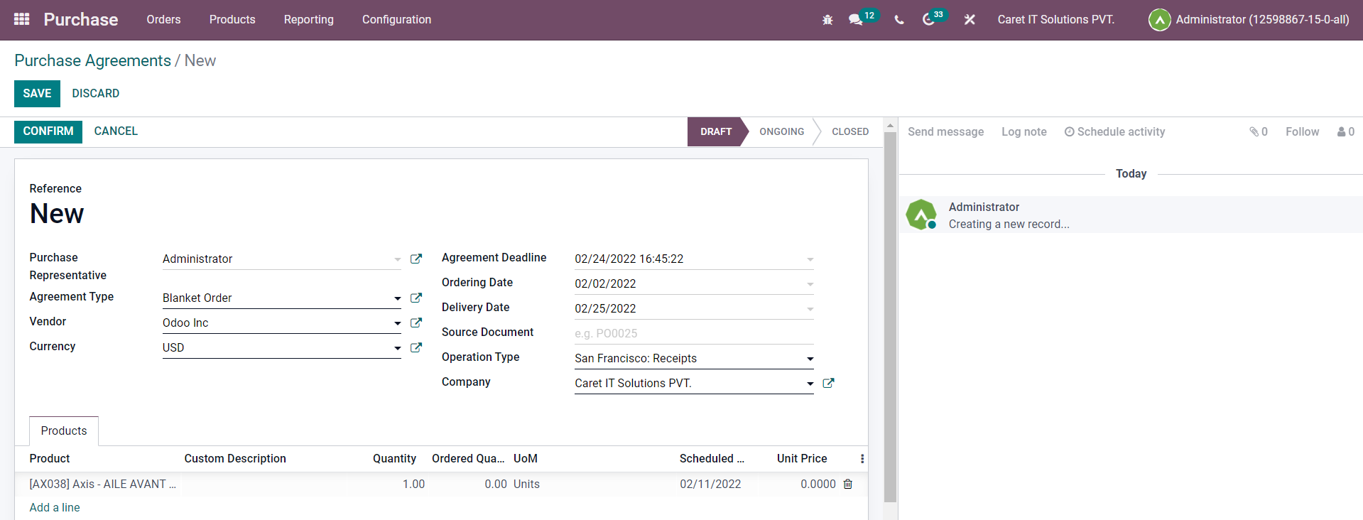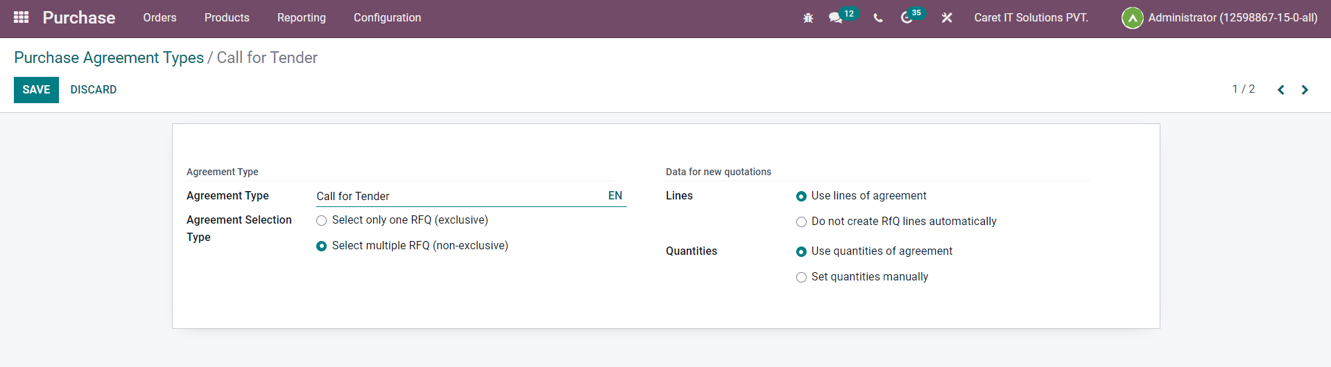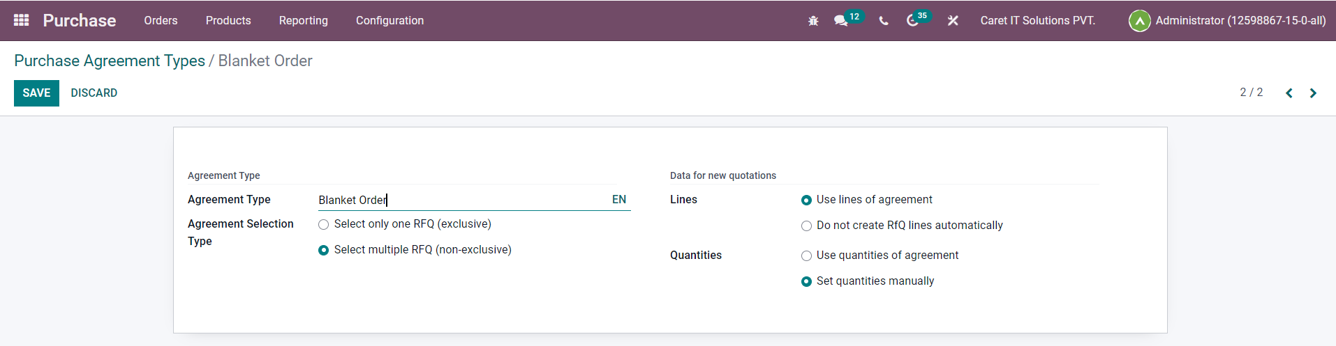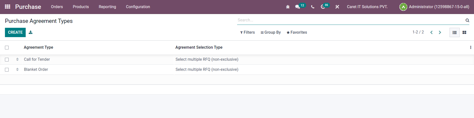 There are two Purchase Agreement types that are available and you can also create a new Purchase Agreement type.