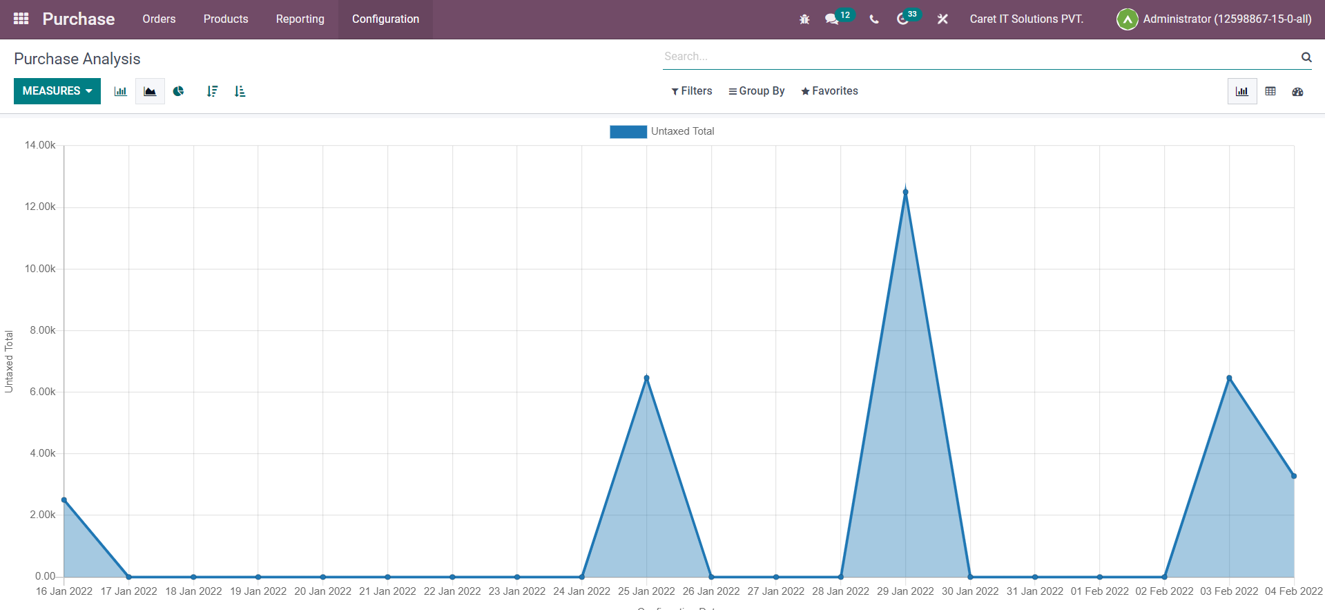 We can see the purchase analysis report in different views (Dashboard, Graph, Pivot) and different filters.