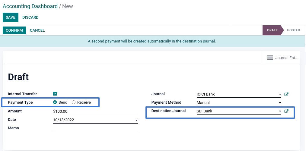 Select Payment type send or receive, then select the destination Journal from where you want to transfer money. Then save and confirm.