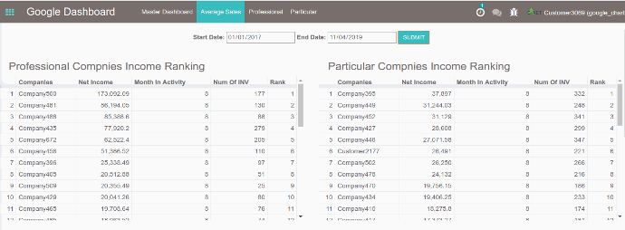 It has information about global income, professional income(one kind of child company group), and particular income(one kind of child company group).